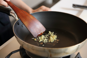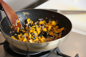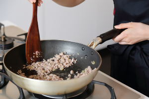 2.フライパンにヘルシーリセッタを敷き、しょうがを香りが出るまでよく炒め、そこに挽肉を加えてさらに炒める。