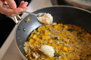 5.カボチャに火が通ったら、玉ねぎとりんごのすりおろしを入れ、さらにAを入れて味を調える。