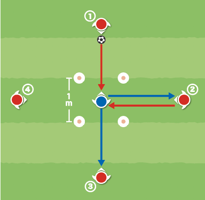 1.マーカー中央の受け手の選手(青)を中心にパス交換