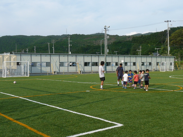 ところがグラウンドの周辺に仮設住宅がネットを隔ててすぐ側まで建つことになりました。砂ぼこりが立つ天然芝グラウンドでは、仮設住宅に住む人に迷惑がかかってしまいます。そのような経緯から、グラウンドを急ピッチで人工芝化することが決まり、8月に人工芝化が完了しました。そして9月から、この人工芝グラウンドで「レベルアップスクール」が始まりました。