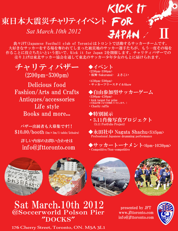 第2回目となる「Kick it for Japan 2」では、約40のブースによるバザーが開催され、日本の書籍をはじめ、衣料品や手芸品などが販売されます。またバザー会場にあるメインステージでは、常時フリースタイルショーやサッカーアトラクション、全員参加型のサッカーゲームなどが催されるとのこと。トロントを代表する日本食レストランやプロフェッショナル和太鼓グループ「永田社中」も協力し会場を盛り上げます。さらに、今年1月にトロントのJapan Foundationで開催された『3.11Portrait Project』の写真展示エリアも設置し、写真や説明ボードによる情報発信も行う予定だそうです。