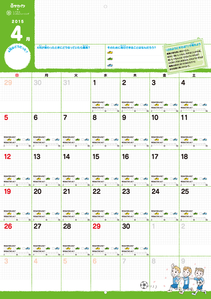 少年サッカーではよく、子どもが「サッカーノート」を書く習慣があります。もちろん、それが子どもたちの成長に一役買っているのは間違いないでしょう。しかしノートは日記と同じで、書ける子は書き続けられますが、たいていは3日坊主になったり、そもそも何を書いていいかわからない子の方が多いのが実情です。そこでサカイクでは、より日常に寄り添い、子どもたちがムリなく書き込める『カレンダー』の形にすることにしました。