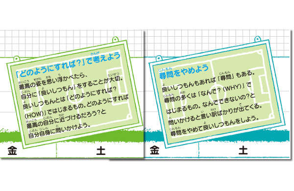 「子どもたちとやってみてわかりましたが、自分にとって意味のある良いしつもんは、日頃からしつもんに答えていないとつくれません。だからこそ、毎日いろいろなしつもんに答えてみることが大切で、とりわけ『考える力』を身につけるためには、『答えがないしつもん』が効果的なのです。答えがないしつもんとは、『サッカーとは何だろう?』『友だちとは?』『チームメイトとは?』など、100人いれば100人が違うことを答えるような問いかけのこと。カレンダーのしつもんは正にそれです。『今月が終わったときにどうなっていたら最高?』なんて、子どもによって全然答えが違いますよね。そういうしつもんや自分なりの答えと向き合うきっかけをたくさんもつことで、子どもたちの考える力とか想像力が磨かれていくのではないかと考えています」