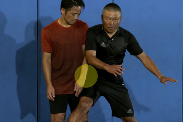 「相手に自分の力を速く、強く伝えるために重要なのが、重心の平行移動です。体のバランスを崩さず、重心を平行移動させて、お尻のくぼんだところの上にある出っ張り(大転子)を相手にぶつけましょう。大転子を相手に当てて、重心を平行移動すれば、最終的には肩もぶつけることができます」