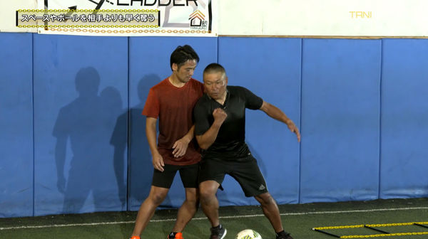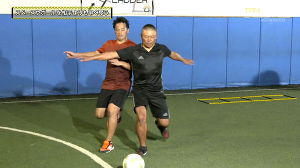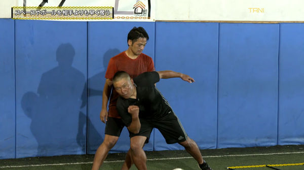 「よくある失敗例が、自分が相手よりボールに近い位置にいて、有利な状態であるにも関わらず、スペースではなくボールを奪いに行ってしまうこと。その結果、ボールのコースによっては、相手に先を越されてしまうことがあります。大事なのは、相手の進路をふさぐコースへ先に入ること。相手とボールの間に自分の身体を入れることで、マイボールにします。スペースを奪うことによって、どんなに速い相手でも、そのスピードを活かすことができなくなるからです。」