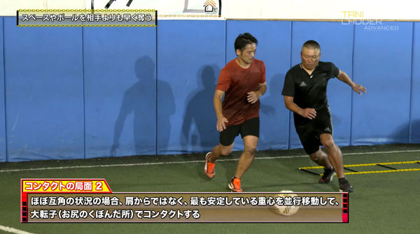 「ボールに対して自分と相手の距離が同じ場合。自分から相手に身体をぶつけて、優位な態勢を作り、マイボールにします。相手にぶつかりに行く際に『ショルダーチャージをしよう』という指導を受けたことがある人もいるかもしれませんが、肩から相手に当たりに行くと、非常に不安定な態勢になってしまいます。相手に肩を当てる場所がずれると、バランスを崩してしまうからです」