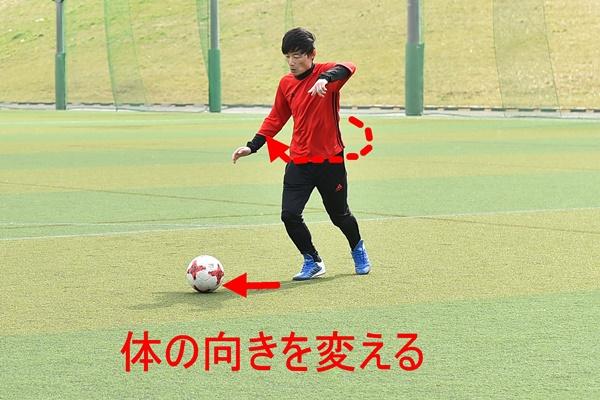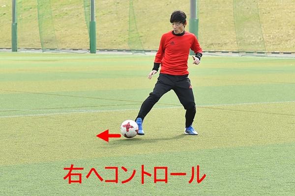 パスを受けるファーストタッチは足元に止めるのではなく、ファーサイド側になる右方向へコントロールしよう。素早く身体をファーサイドへ向けやすくなり、蹴るときにも身体をひねりやすくなる。
