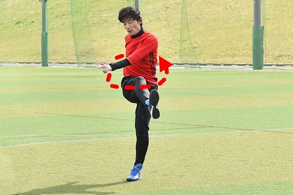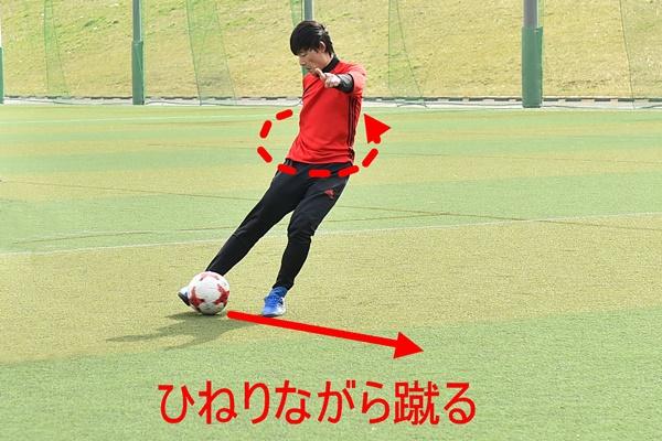 4.相手DFとGKが釣られてファーをケアしに動いたのを見たら、素早く身体を回転させてニアサイドへシュート