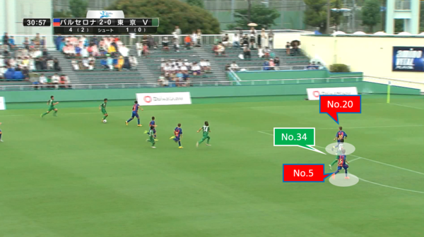 バルセロナのセンターバック20番と5番の選手は、ボールの位置によって、マークすべき相手のフォワード34番の選手との距離を変えていました。