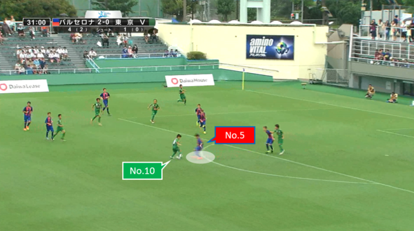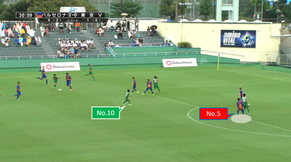 そして、相手のボール保持者が中へ切れ込んできた時、パスを受ける可能性があった相手10番の選手との距離を詰めました。