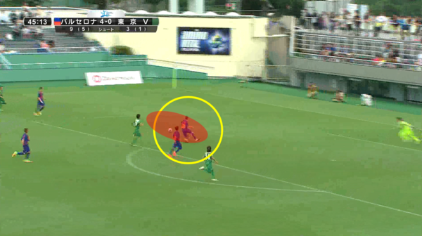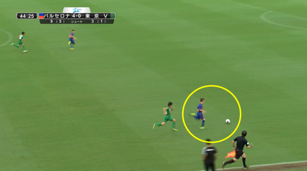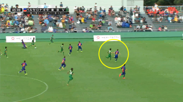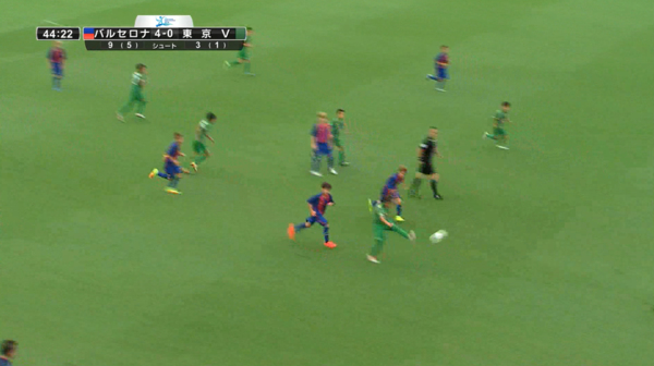 以下のシーンでその様子を見ることができます。攻撃で前がかりになっていたバルセロナからヴェルディがボールを奪い、カウンターとなったシーンです。