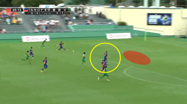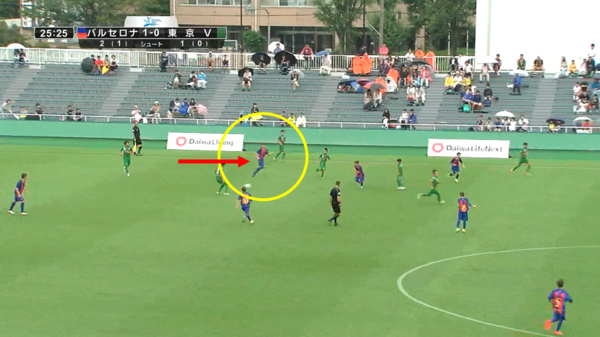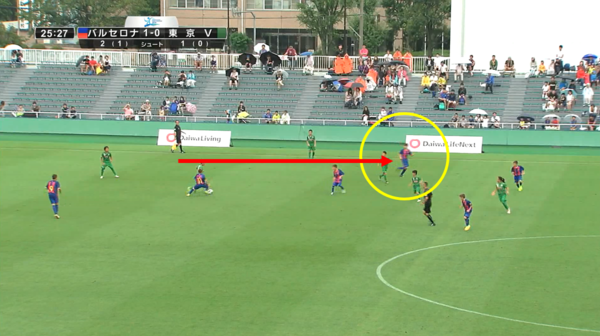 バルセロナとヴェルディの試合で見てみましょう。黄色の丸で囲んだウイングの選手がボールを奪われ、ヴェルディのディフェンダーに縦パスを出されてしまいました。