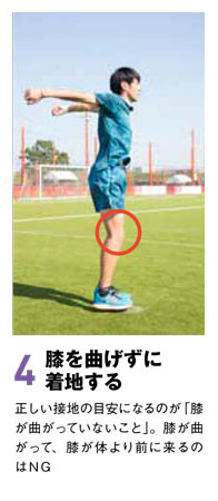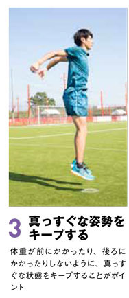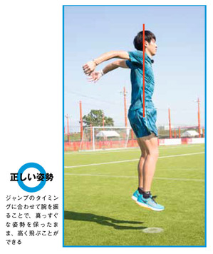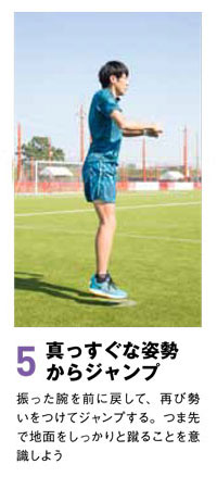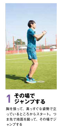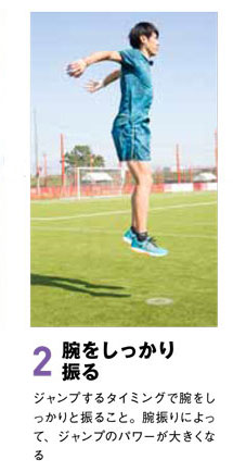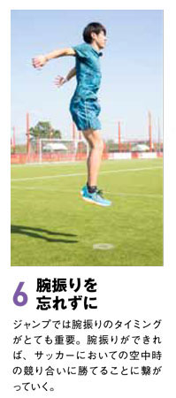 このトレーニングで重要になってくるのが「腕振り」です。足の力だけで跳ぼうとするのではなく、腕もしっかりと使うことで、より高く、大きく、飛ぶことができます。腕振りのタイミングがつかめれば、サッカーにおける空中戦のヘディングなど競り合いに勝てるジャンプができるようになります。