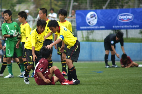写真はダノンネーションズカップ2011 in JAPAN 決勝大会の準々決勝(ヴィッセル神戸U-12 vs 柏レイソルU-12)試合後の様子です。0-1で敗退し涙するヴィッセルの選手にいち早く駆け寄り、手を差し伸べるレイソルの選手たち。最近では、試合後にこういったシーンを見かけることがとても多くなってきましたね。日々の厳しいトレーニングや、チーム内での競争、数々の厳しい戦いを経て、相手を思いやる、リスペクトすることの大切さを彼らは理解しているのでしょう。