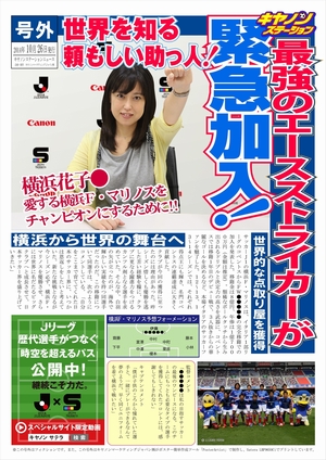 同イベントでは、君こそクラブの救世主!と題し、来場者が横浜F・マリノスの新加入選手となって記者会見をしたという設定で、スポーツ新聞に見立てたオリジナルの号外を作成できる。キヤノンの一眼レフカメラ「EOS Kiss」で撮影した写真と、参加者のグループ名や名前を、ポスター制作ソフト「PosterArtist」で編集し、レーザービームプリンター「Satera LBP」で印刷したものをその場で持ち帰ることが可能。
