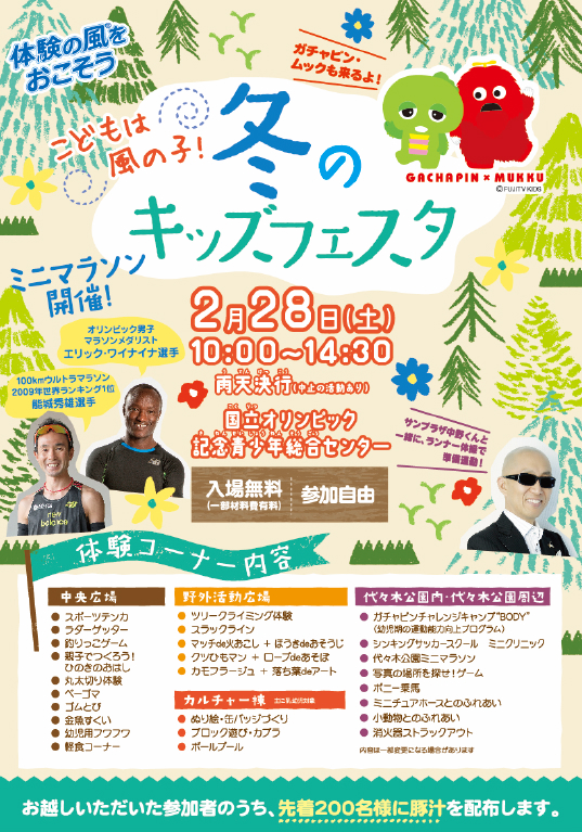 「体験の風をおこそう こどもは風の子!冬のキッズフェスタ」が28日に国立オリンピック記念青少年総合センターにて開催される。