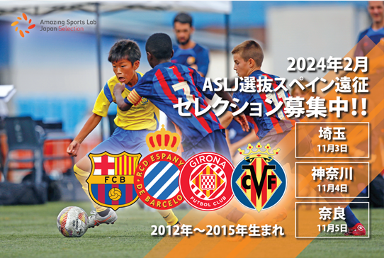 FCバルセロナキャンプやU-12ジュニアサッカーワールドチャレンジを主催する株式会社Amazing Sports Lab Japanが、小学2~5年生(小学6年生の早生まれ含む)の選抜選手による「ASLJ選抜」を結成し、2024年2月にスペインで行われる大会に出場。それに伴い、メンバー24名を決める国内セレクションを開催します。詳細は以下の通りです。
