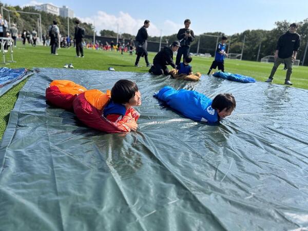 コールマンの人気商品テイク6を運ぶ障害物レース「テイク6を運べ!サーキット」や寝袋を使って体を動かす、アウトドアブランドらしい遊び心満載のコンテンツ「寝袋芋虫」など、サッカー経験の有無を問わず、子どもたちが夢中になれる多彩なプログラムを用意。ユニークなアトラクションで活気にあふれていました。