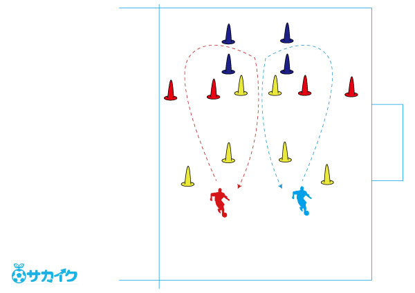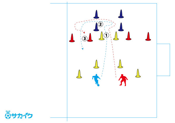 ドリブル競争で配置したゲートをそのまま利用します。この練習の狙いは、相手とのかけ引きを覚えてもらうこと。相手の動きを見ながら、「こっちに動けば、相手はこう動いてくるだろうな」というように予測しながら相手の逆を取れるように、積極的にかけ引きを促してあげましょう。