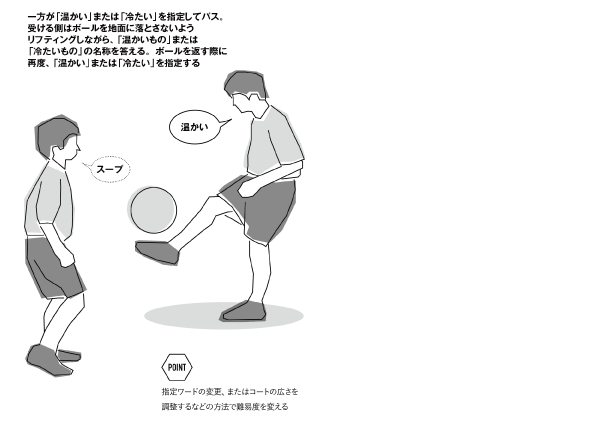 2人一組でリフティングをしながら、パスをする際に「温かい」もしくは「冷たい」を指定します。パスを受ける側は、「温かい」と指定されたら「温泉」などの具体的な温かいものの名前を答え、「冷たい」を指定されたら「氷」などの具体的な冷たいものの名前を言いながらボールを受けます。そして、相手にパスを返す際に「温かい/冷たい」を指定します。