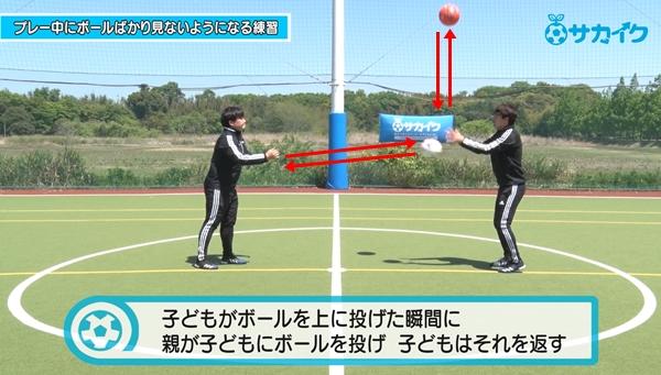 5.子どもはボールを上に投げ、同時に親は足元にパス
