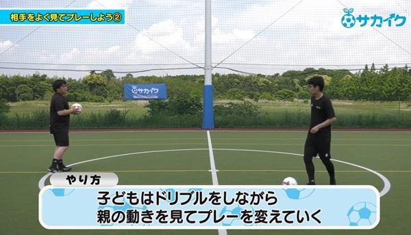 サカイクがお届けする『親子で遊びながらうまくなる!サッカー3分間トレーニング』。今回はサッカー初心者の悩み「ドリブルするとき顔が下がってしまい、相手や周りが見れない」を克服するトレーニングをご紹介します。