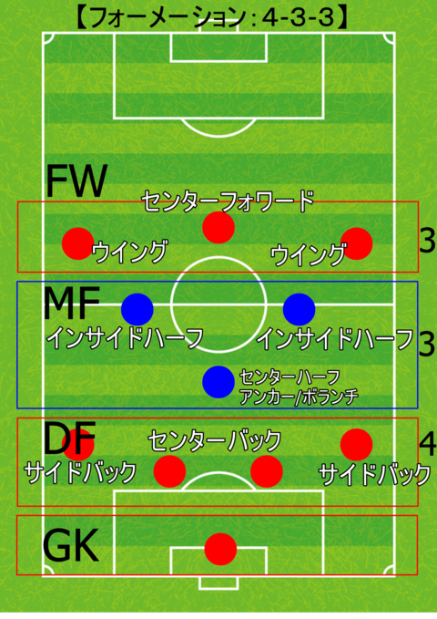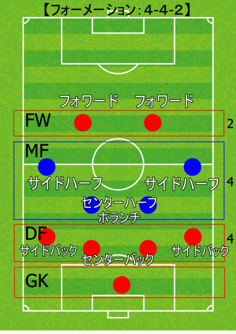 セントラル・ミッドフィルダー →中盤の中央に2人のMFを配置するポジション。4-4-2や3-4-3などの中盤を1列にする構成と4-2-3-1や3-2-3-2などの中盤を2列にする構成がある